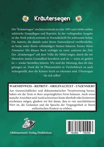 Der "Kräutersegen" erschien erstmals im Jahr 1895 und erlebte seither zahlreiche Neuauflagen und Reprints. In der vorliegenden Ausgabe ist das Werk jedoch erstmals in Normalschrift statt Fraktur, und so für jedermann lesbar. Die Autorin, die damals unter ihrem Namenskürzel veröffentlichte, ist heute unter ihrem vollständigen Namen bekannt: Emma Maria Zimmerer. Mit diesem Buch verfolgte sie unter anderem das Ziel: Der „Kräutersegen“ soll dem Volke die Mittel zeigen, durch die wir Menschen unsere Gesundheit bewahren und sie — wenn sie gestört ist — wieder herstellen können. Wir sind der Meinung, dass ihr dies gelungen ist. Dank der 56 Pflanzentafeln in Vierfarbdruck ist auch sichergestellt, dass die Kräuter leicht zu erkennen sind. Überzeugen Sie sich selbst!Die Bedeutung unserer vorzüglichsten heimischen Heilkräuter in Sitte, Sage, Geschichte und Volksglauben; ihr wirtschaftlicher und industrieller Nutzen und ihre praktische Verwendung als Hausmittel.