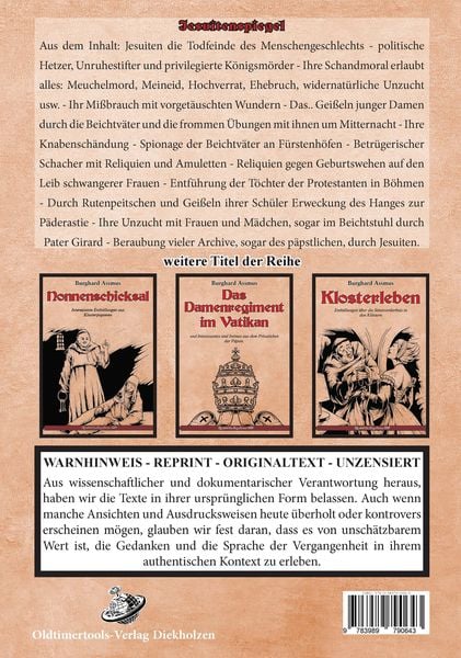 Jesuitenspiegel Aus dem Inhalt: Jesuiten die Todfeinde des Menschengeschlechts - politische Hetzer, Unruhestifter und privilegierte Königsmörder - Ihre Schandmoral erlaubt alles: Meuchelmord, Meineid, Hochverrat, Ehebruch, widernatürliche Unzucht usw. - Ihr Missbrauch mit vorgetäuschten Wundern - Das.. Geißeln junger Damen durch die Beichtväter und die frommen Übungen mit ihnen um Mitternacht - Ihre Knabenschändung - Spionage der Beichtväter an Fürstenhöfen - Betrügerischer Schacher mit Reliquien und Amuletten - Reliquien gegen Geburtswehen auf den Leib schwangerer Frauen - Entführung der Töchter der Protestanten in Böhmen - Durch Rutenpeitschen und Geißeln ihrer Schüler Erweckung des Hanges zur Päderastie - Ihre Unzucht mit Frauen und Mädchen, sogar im Beichtstuhl durch Pater Girard - Beraubung vieler Archive, sogar des päpstlichen, durch Jesuiten. Jetzt in Normalschrift, statt Fraktur. 39,95 €