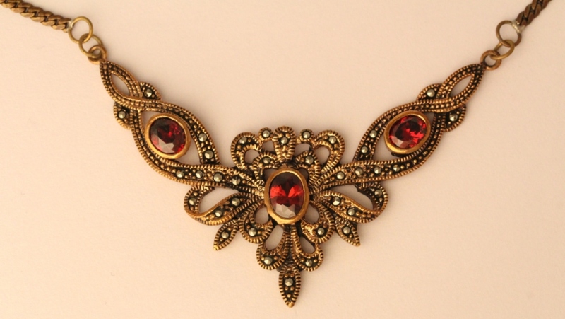 Die drei feuerrot funkelnde Kubik Zirkonia- Kristallsteine und die vielen kleine, glitzernde Markasitsteinchen schmücken die Kette..